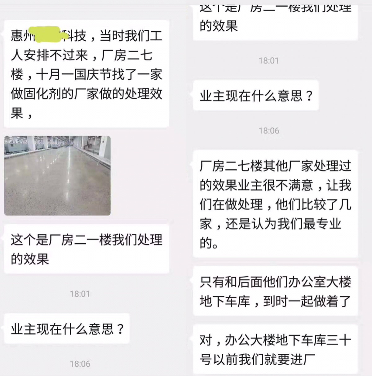 2015年,新疆富丽达纤维(现已改为:新疆中泰纺织集团)使用了金铸固化剂地坪进行地面固化,4年后的2019年,当有了地坪固化的需求时,客户在第一时间联系了金铸品牌,仍然希望金铸可以解决他们的问题,当然,金铸不负所托,圆满完成任务,再次获得客户好评。这种好口碑还体现在与同行的对比当中,惠州一公司在第一期工程中使用了金铸固化剂,但由于国庆节期间金铸工人忙不过来,他们就找了另外一家做了一部分,这一做就看出了二者的差距,用客户的话来说:比来比去,还是金铸最专业,因此在接下来的工程中,他们仍然要求使用金铸固化剂,并希望由金铸的施工技术人员前来施工,无论是材料,还是人工,都获得了客户的一致好评。